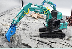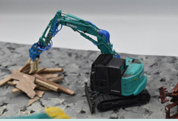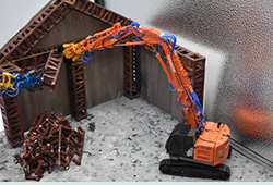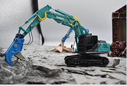 ダイナミックに稼働する解体重機。長く伸びるアームやがっちりと掴むアタッチメント「フォーク」など、現場で動く様子は迫力満点です。このページは、そんな重機や解体現場の様子を、ミニチュアやジオラマとして表現した作品をご紹介しています。
