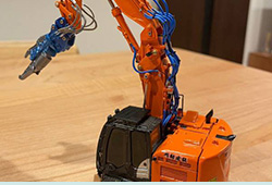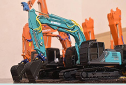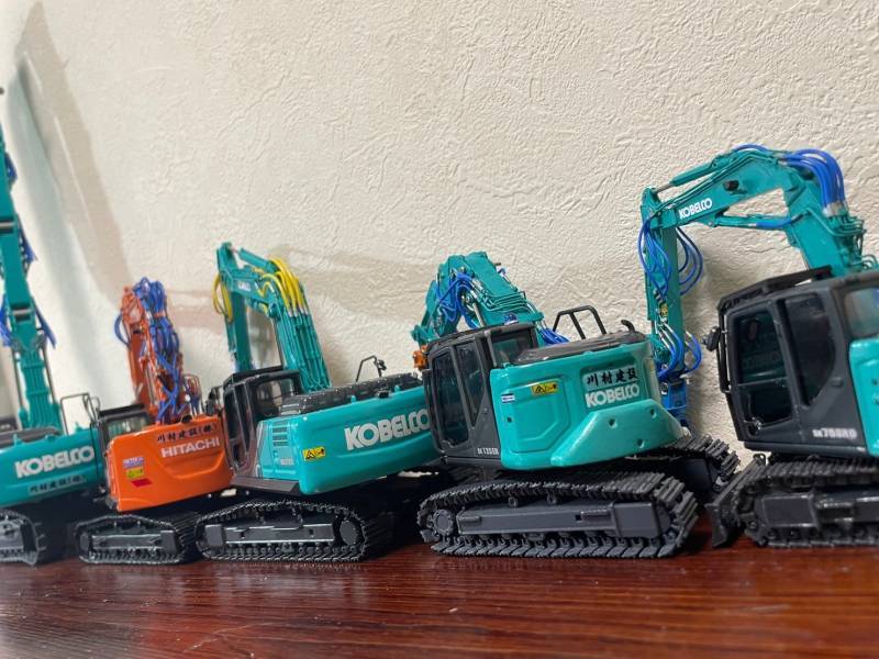 これらの模型は、すべて当社へ見学に訪れる学生(川村海翔さん:掲載当時高校生)が作成したもので、市販の重機モデルをベースにカスタマイズした作品。アタッチメントなどは実物を観察して自作、重機のディテールや汚しなども忠実に再現し、丁寧に仕上げています。その完成度の高さは、重機メーカーからも賞賛されたほどです。
