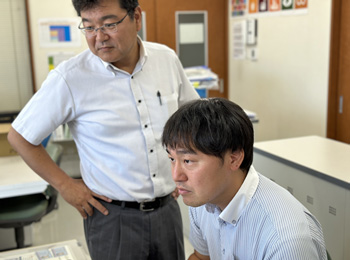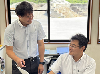 解体のプランについて上司と協議するY.I.さん。建物解体は常に危険も伴うため、事前に綿密な計画を検討し、入念なチェックを行います。