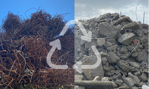 建物解体においては多くの廃材が発生しますが、その中には再資源化できる部材も多く含まれます。当社では、解体において屋根材・内装材(建具・石膏ボード・畳・照明器具等)の先行撤去を行い、そのうえで建物解体(木くず、鉄骨、構造材等)と基礎解体(コンクリート等)の分別を実施、リサイクル率の向上を高める解体を実現しています。
